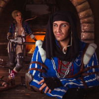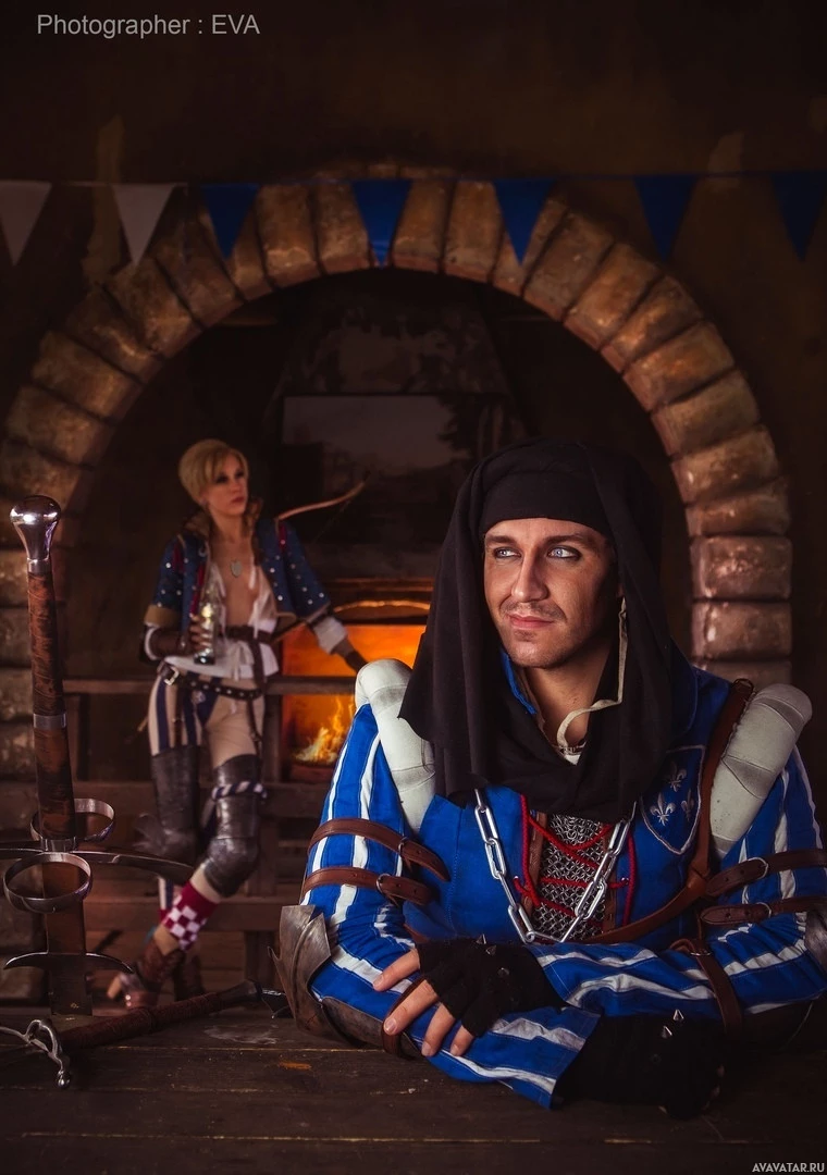 The image shows two individuals dressed in costumes that resemble those from the "The Witcher"