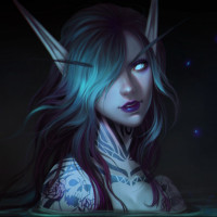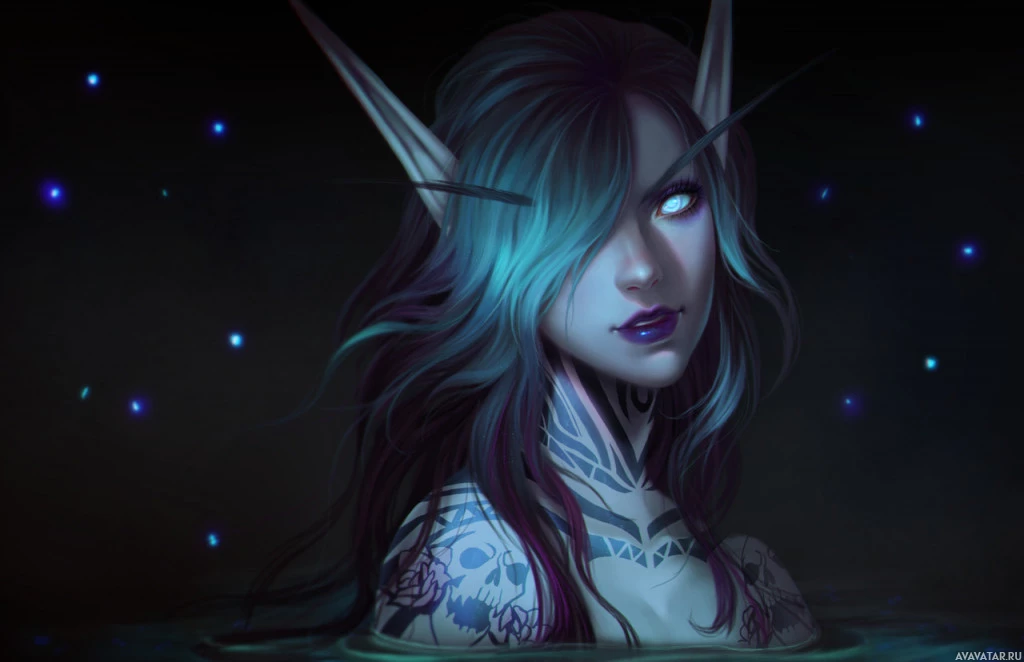 a fantasy character, which appears to be an elf with blue hair and striking features. The character has tattoos on their face and arms, suggesting a connection to certain mythical or darker elements in this