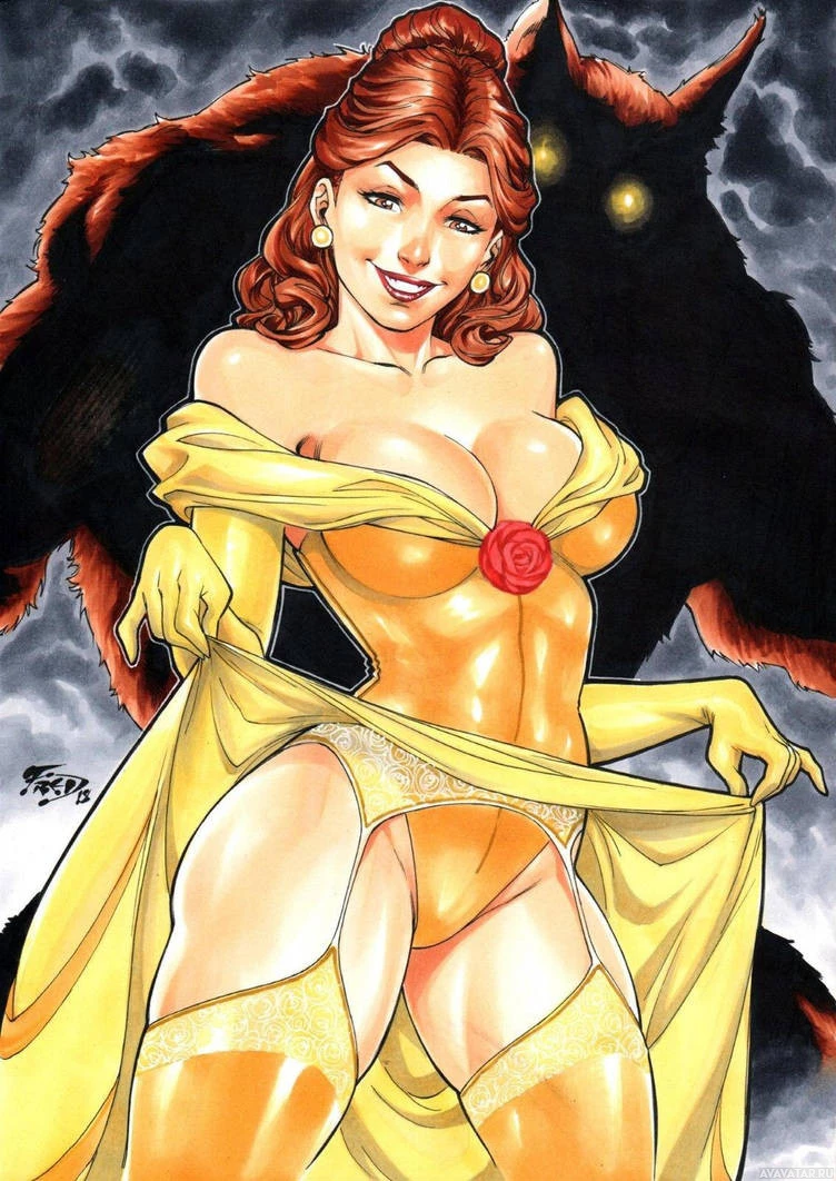 red hair, wears a yellow dress with red accents and high heels, and her expression seems to be one of excitement or enthusiasm. Behind her, there's