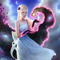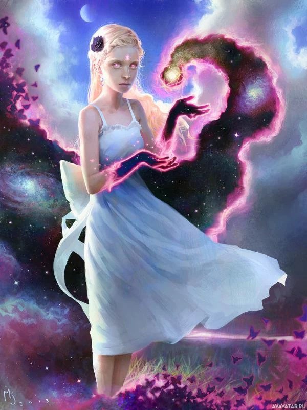 mystical setting. The overall theme of the image seems to be a blend of fantasy elements with a cosmic or magical atmosphere.