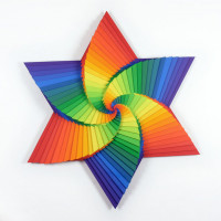 art piece that resembles a star-shaped kaleidoscope. It is composed of multiple colored segments arranged in
