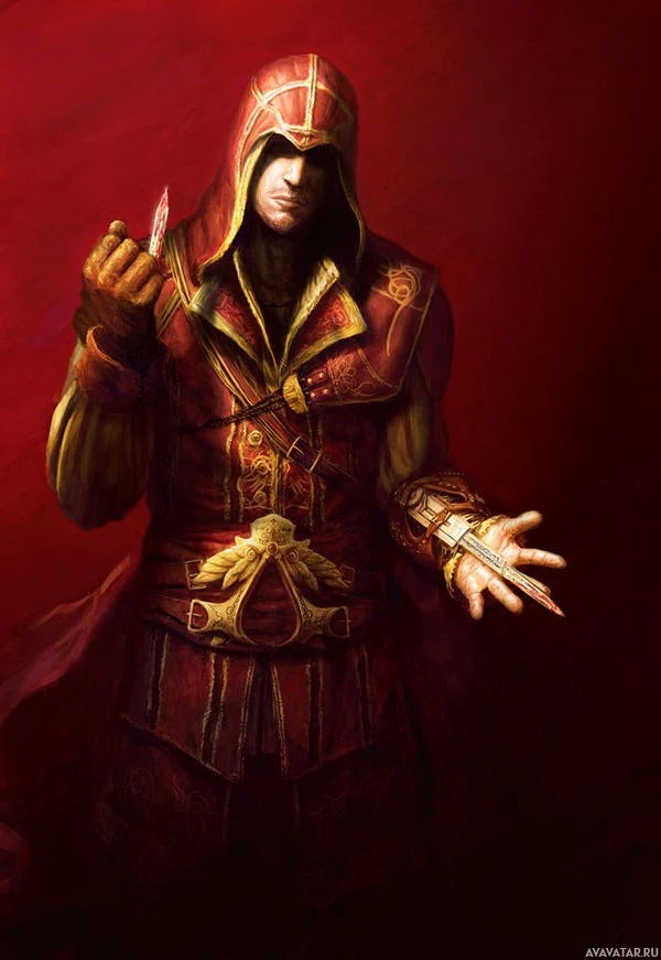 The image depicts a character from the "Assassin's Creed" series, dressed in an ornate costume with