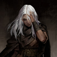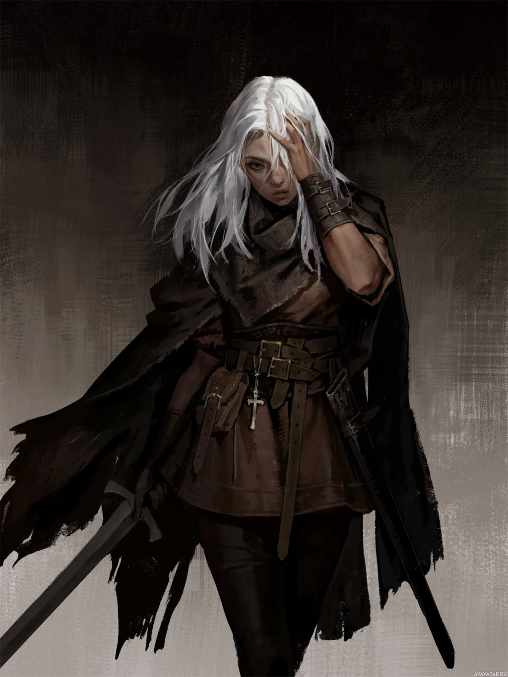 На картинке изображен персонаж с длинными белыми волосами, носящий то, что кажется доспехами и держащий меч. У нее на лице задумчивое выражение и она смотрит немного в сторону от зрителя. Это произведение искусства может подпадать под категории фэнтези или исторических жанров.