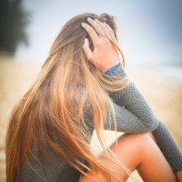 blond hair and is wearing what appears to be a grey sweater or jacket over a short-sleeved top. Her head is tilted downwards, and she seems to have her hand near her face, possibly in a contemplative or thoughtful pose. The background suggests it might be an island setting with