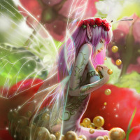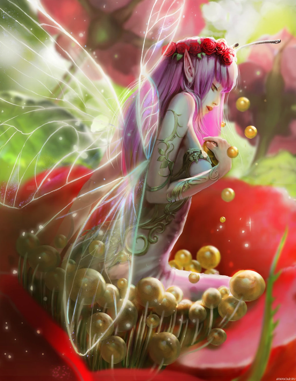 a fantasy scene featuring an elf or fairy. The character is seated on a flower, surrounded by what appears to be magical elements such as orbs and sparkles. She has long