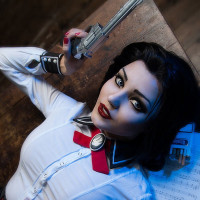 the video game "Bioshock" due to the visual style, especially with the combination of elements like the straps on her shoulders and the setting that could be reminiscent of the games' environments.