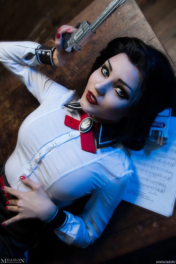dark hair, makeup that includes red lipstick and eyeshadow, and she's wearing a white shirt with black straps over her shoulders. Her right hand is holding what appears to be a revolver or