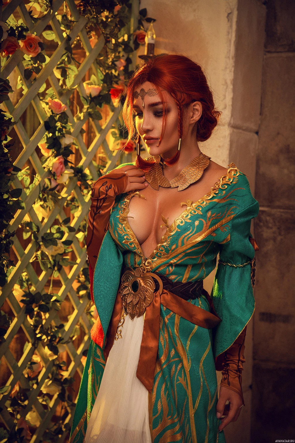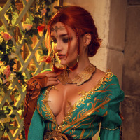 Triss Merigold from "The Witcher 3: Wild Hunt," a popular action role-playing game. The individual is wearing elaborate