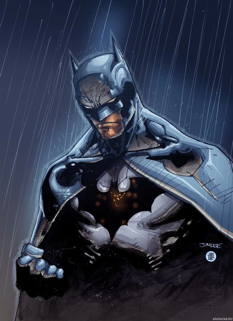 The image shows a character known as Batman, standing in the rain. He is wearing his