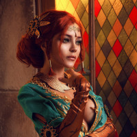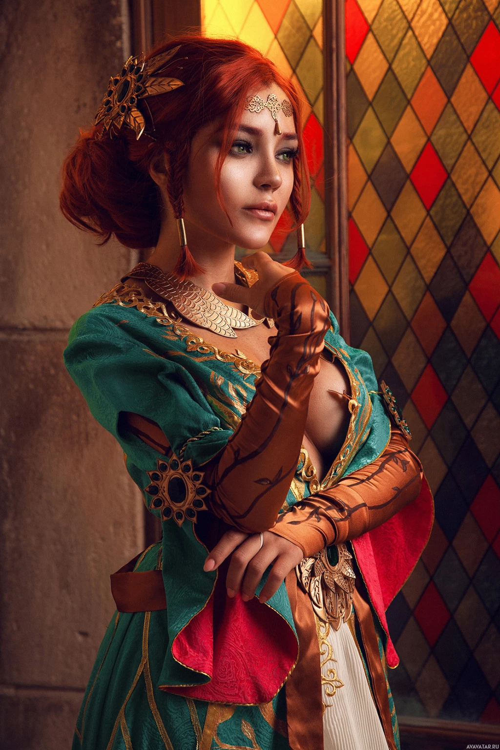 Triss Merigold from "The Witcher" series. The costume includes a detailed green dress with red accents and a headdress, accessorized with jewelry and intricate designs that suggest a fantasy or medieval setting typical of