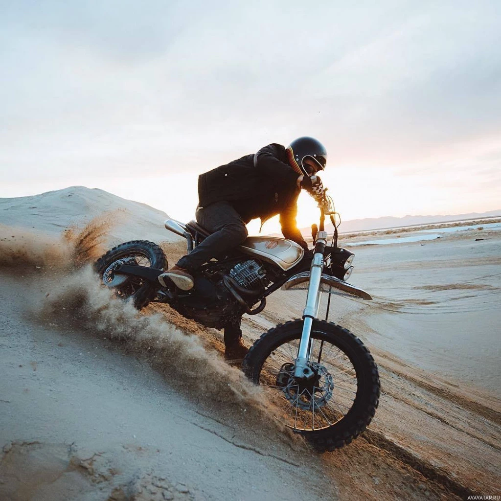 a dirt bike in the desert. He appears to be leaning into a turn, and sand is being kicked up by his movement, suggesting
