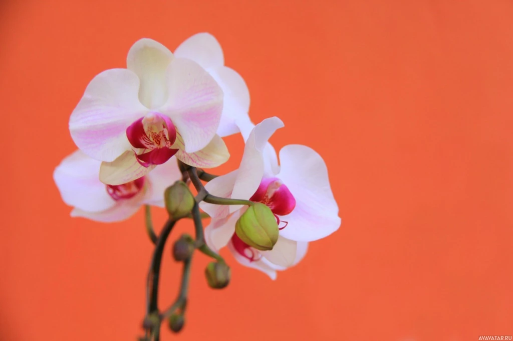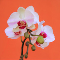 На снимке изображена одинокая розовая орхидея с красными и белыми вставками. Фон - оранжевая стена, которая контрастирует с нежными лепестками цветка, выделяя его на общем фоне.