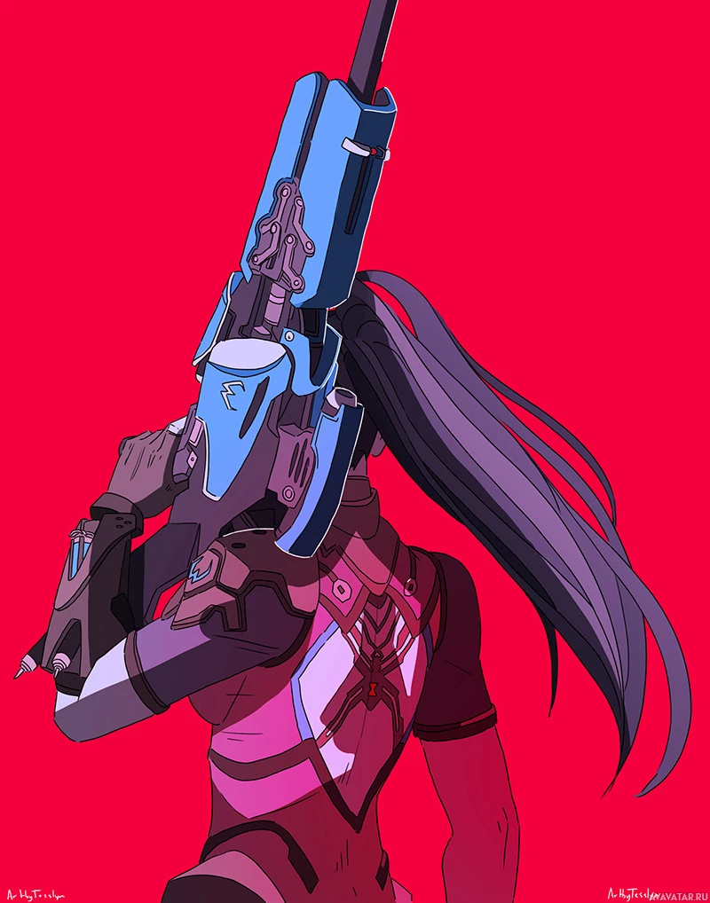 На картинке изображен иллюстрированный персонаж, который, кажется, является вдоводелом из видеоигры «Overwatch». Она носит свой фирменный герметичный наряд и держит оружие, которое выглядит как ее снайперская винтовка.
