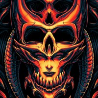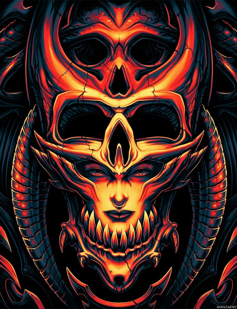 various shapes and designs that give it an intimidating appearance. Inside the skull, there are what appear to be demonic faces, possibly indicating a multiple-headed entity or a representation of