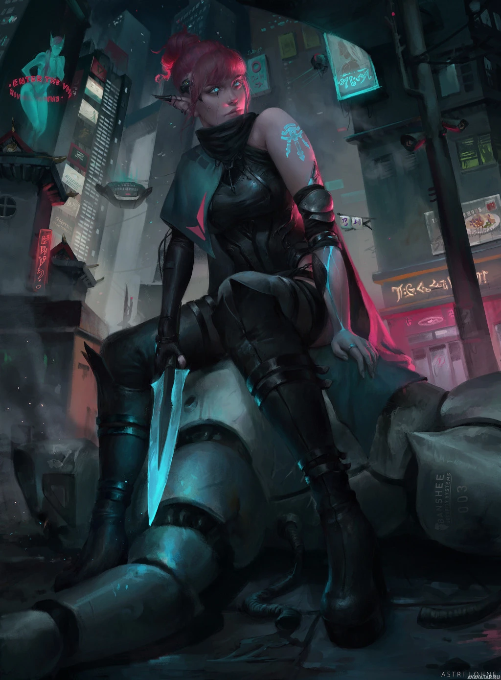 a science fiction setting. The character has a determined expression on her face, looking straight ahead. There are various signs and graffiti visible around her, contributing to the atmosphere of