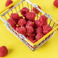 The image features a yellow basket filled with red berries, which are likely raspberries. They are placed on a bright yellow background that contrasts well with the vibrant color of the berries.