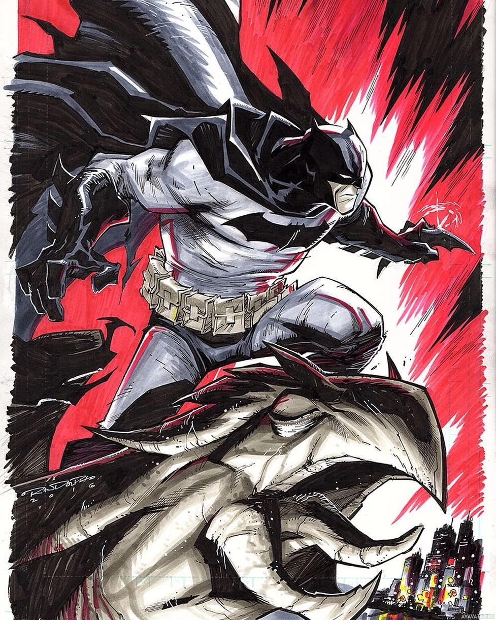 The image depicts an illustration of Batman, a well-known