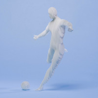 The image shows a 3D model of a person playing soccer. The model is designed to mimic the human form and is captured mid-action, kicking a ball with one leg extended forward. This type of image could be used for various purposes such as showcasing design techniques in sportswear or demonstrating motion capture technology in animation.