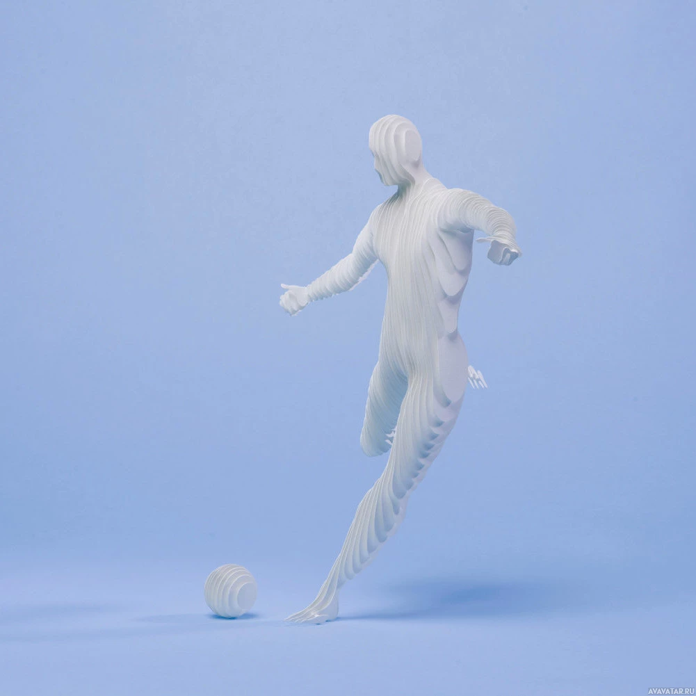 На картинке изображена 3D-модель человека, играющего в футбол. Модель предназначена для имитации человеческой формы и захватывается в середине действия, ударяя мяч одной ногой, вытянутой вперед. Этот тип изображения может использоваться для различных целей, таких как демонстрация методов проектирования в спортивной одежде или демонстрация технологии захвата движения в анимации.