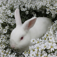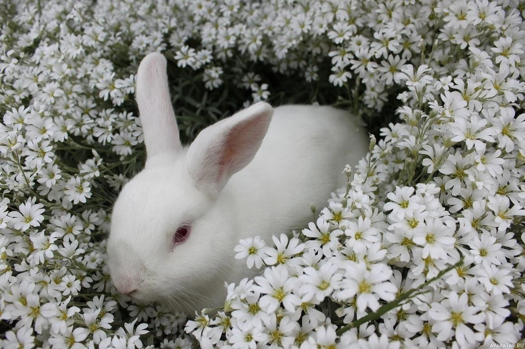 На картинке изображен кролик, расположенный среди белых цветов с желтыми центрами. Это, по-видимому, живописная сцена, часто связанная с идеей весны или Пасхи, учитывая присутствие кролика и цветочную обстановку.