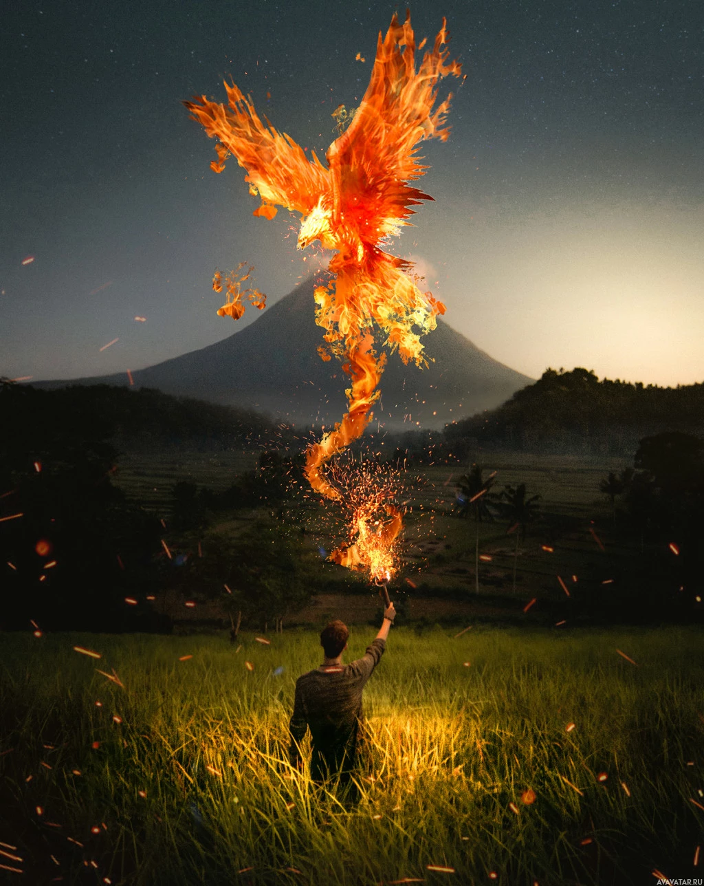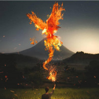 a field at night, holding a staff with a phoenix on it. The phoenix is engulfed in flames and appears to be summoned from the staff or emerging into existence from the flame. There are fireworks exploding in the background, creating an intense and dramatic atmosphere. The setting suggests a fantastical or magical environment, possibly representing a scene from a story, game, or concept