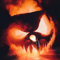illuminated pumpkin with a carved face that resembles a skull or jack-o'-lantern. The pumpkin is dramatically lit from within, and smoke or mist is visible around it, creating