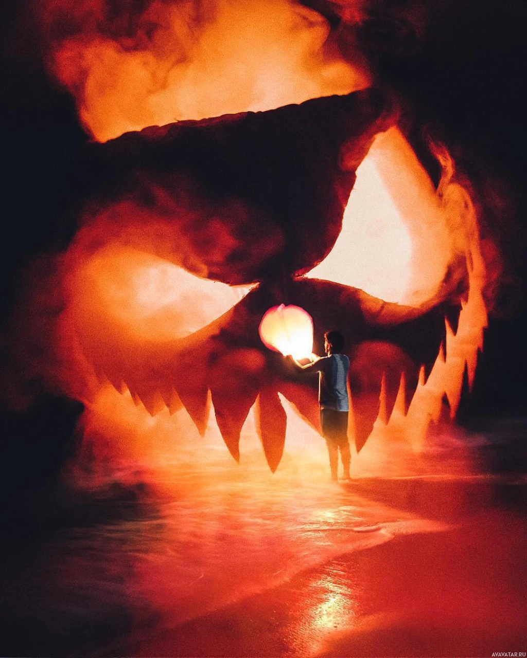 an eerie atmosphere typical for Halloween decorations. The person appears to be holding