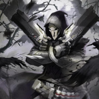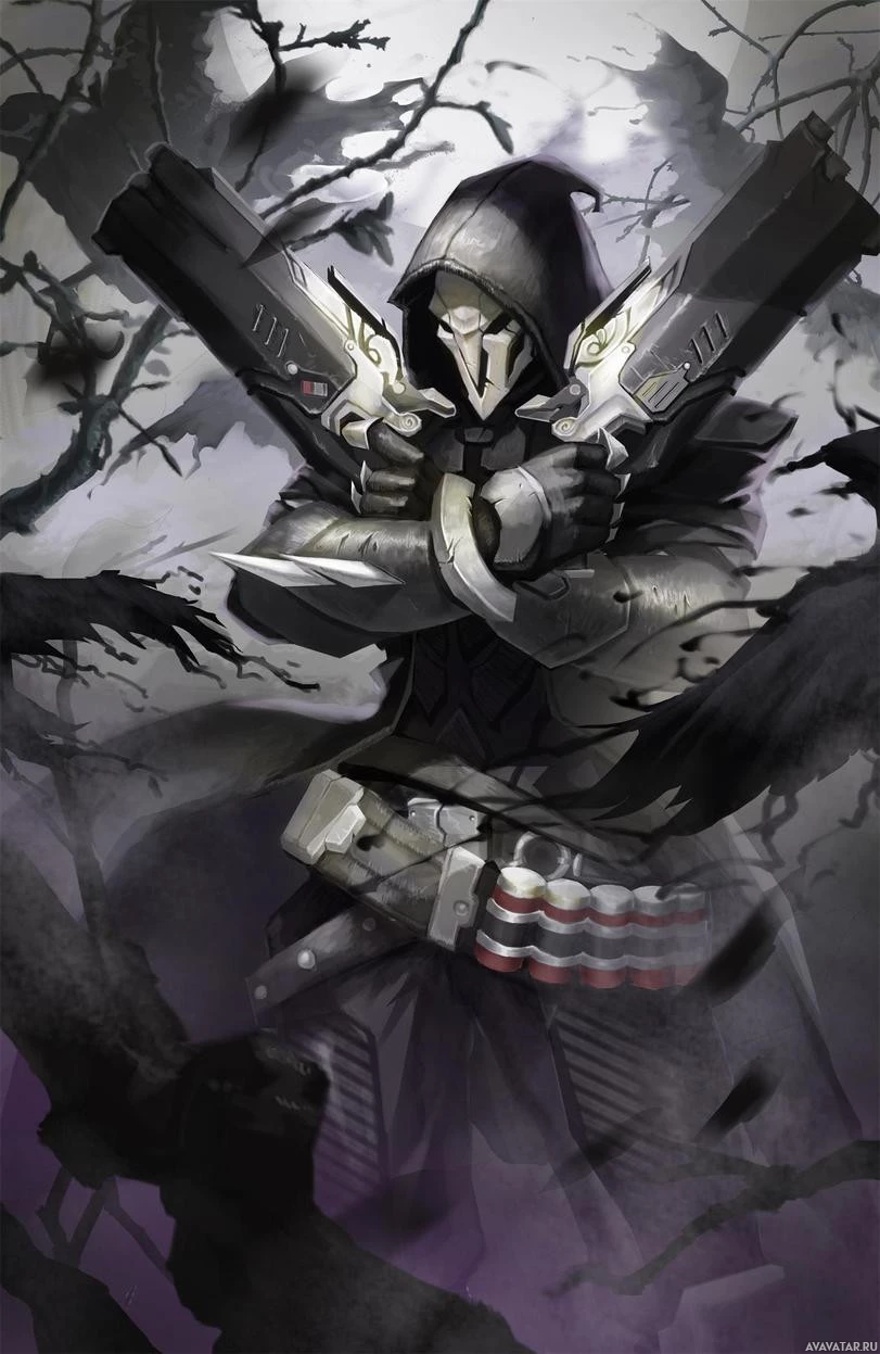 a hooded cloak, giving him an ominous appearance. Reaper is known for his dual-wielding of guns, often with one in each hand. The background suggests a dark or moody setting, possibly indicating that the character is in