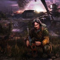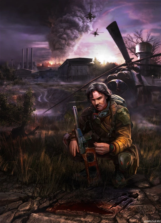 an outdoor setting that looks post-apocalyptic or war-torn. He is holding what seems to be a rifle with one hand, and there are