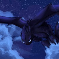 The image shows an animated dragon character, resembling Toothless from the "How to Train Your Dragon" franchise. It's depicted in a dynamic pose with spread wings, as if flying or preparing to fly through a night sky filled with clouds and stars.