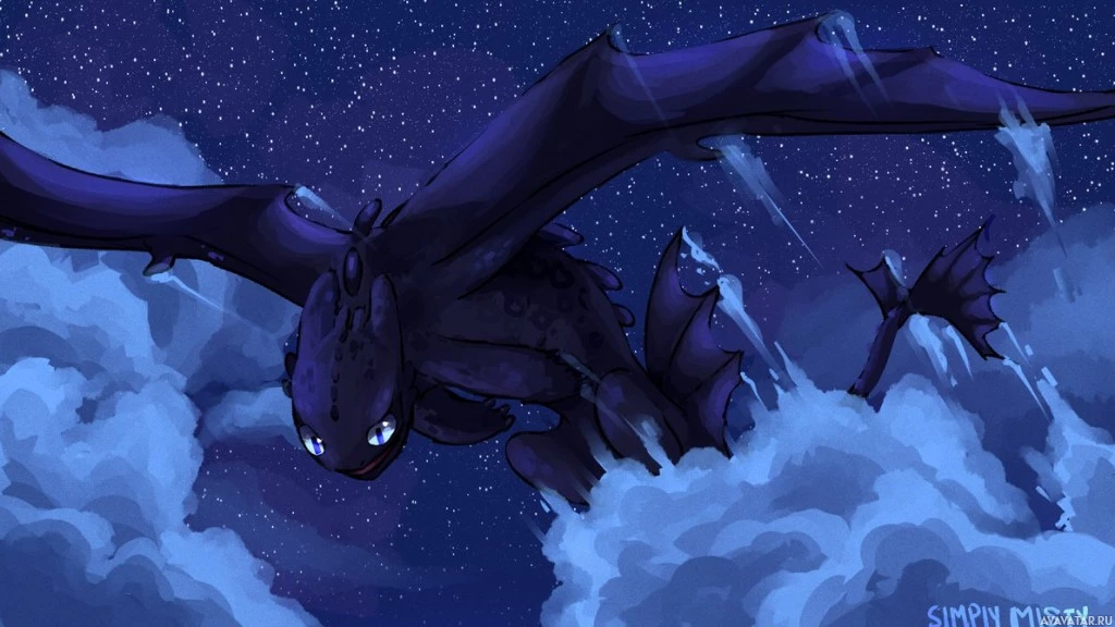 На картинке изображен анимированный персонаж дракона, напоминающий Беззубика из франшизы «Как приручить дракона». Она изображена в динамической позе с раскинутыми крыльями, словно летит или готовится пролететь сквозь ночное небо, наполненное облаками и звездами.