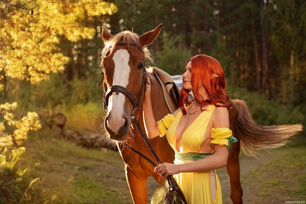 red hair and an elf-like appearance, seated on the back of a brown horse. They are wearing what appears to be a fantasy or fairy