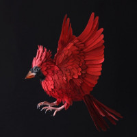 На картине изображена птица, а именно красная ара с полностью расставленными крыльями. Птица захватывается в середине полета, создавая впечатление движения и свободы.