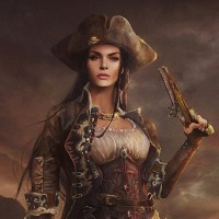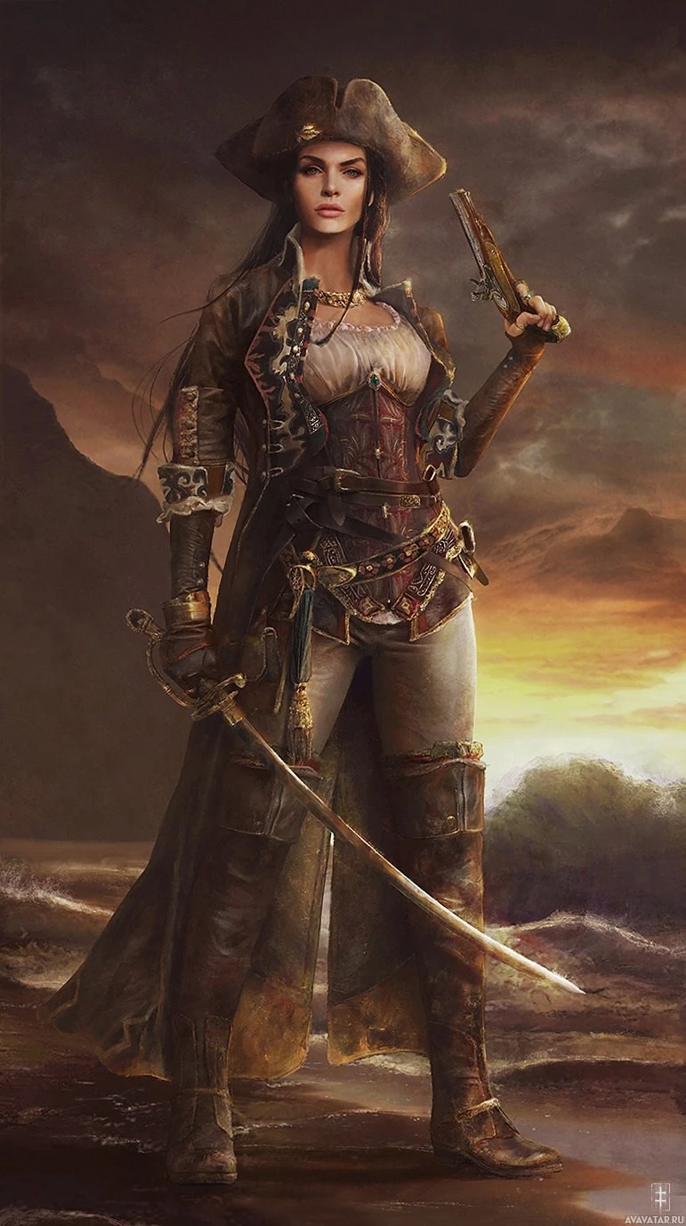 a female character dressed as a pirate. She is wearing armor, including a breastplate and greaves, with