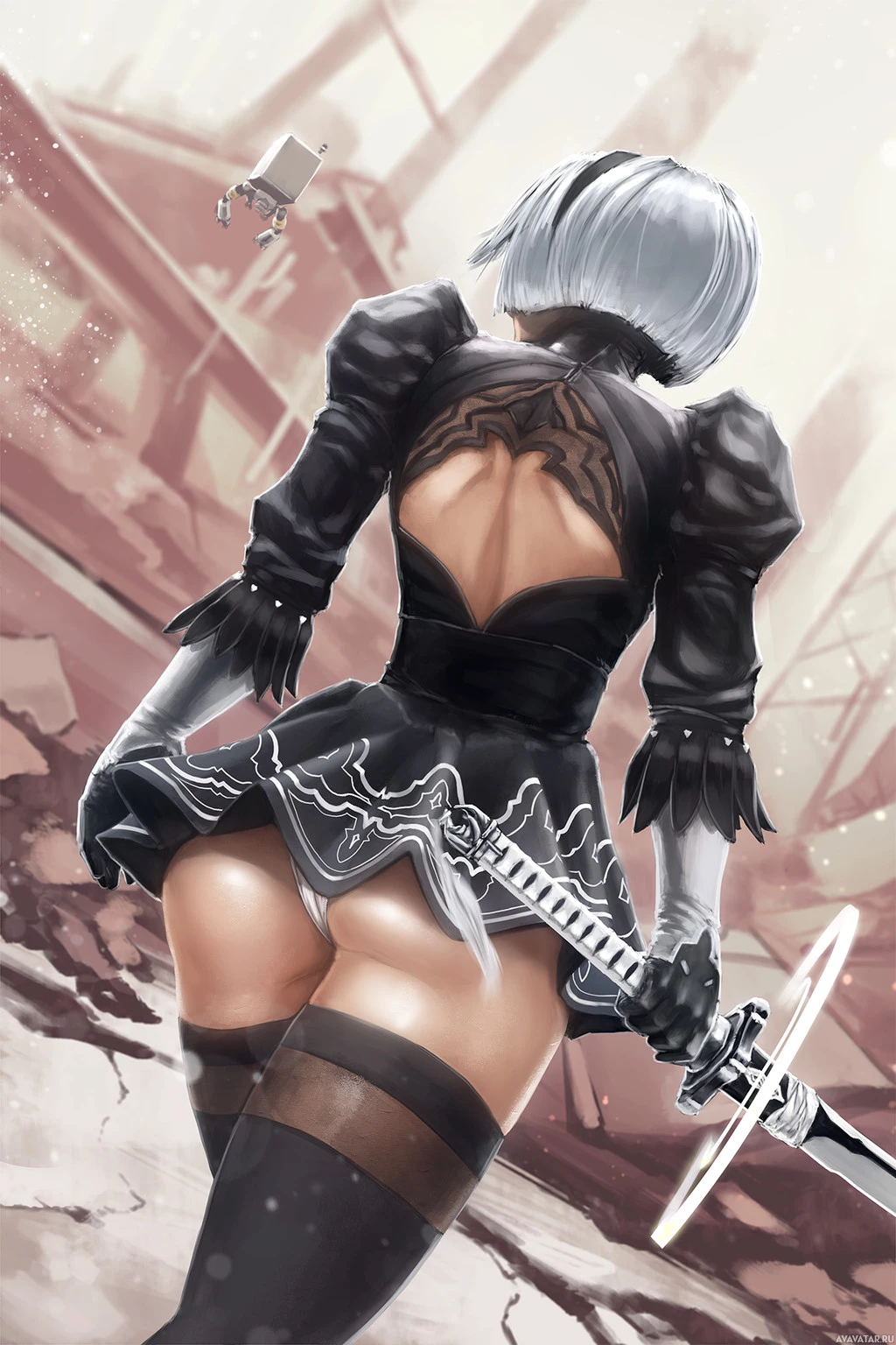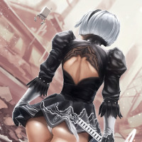 the video game "Nier: Automata." The character depicted is known for her black and white outfit, which often features lace elements. She is holding a sword with a handle shaped like a heart, a signature weapon style from the series. The background suggests