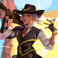 На картинке изображен анимированный персонаж по имени Эш из игры «Overwatch». Она изображена в динамической позе, держа винтовку и динамитную палку, пока ее волосы отдуваются назад, что указывает на движение или силу ее действий. На ней ковбойская шляпа и решительное выражение лица.