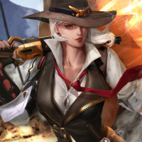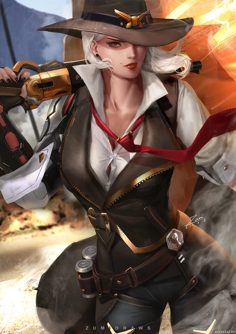 a large gun with one hand and smoking a cigarette in the other. The background suggests