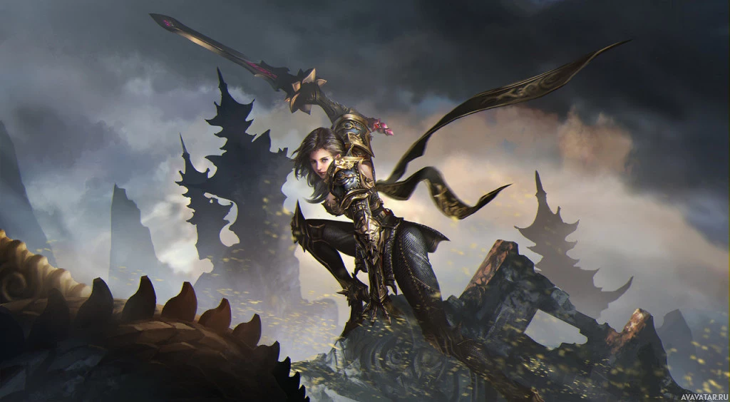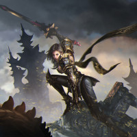 the foreground with a sword in her hand. She has an armored outfit and wings on her back, suggesting she may be some sort of