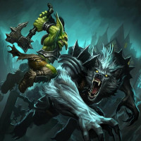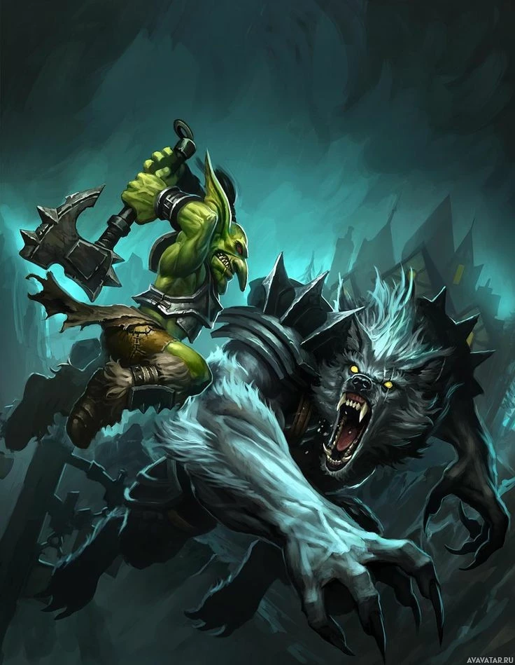 hind legs, showing aggressive behavior with its mouth open as if growling or roaring. The goblin, equipped with a weapon similar to an axe, stands ready for battle. The setting suggests a dark and ominous atmosphere, which is consistent with the fantasy theme of the image.