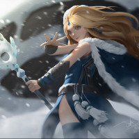 winter attire, suggesting she may be from a fantasy or cold setting. In her hand, she holds what appears to be a staff or wand, which could imply she has