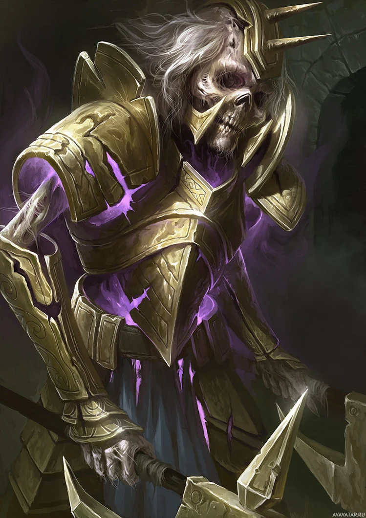 The image shows a fantasy-themed illustration of a skeleton. The skeleton is depicted as a character, wearing armor that appears to be gold or bronze in color. It has