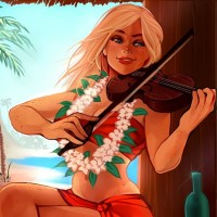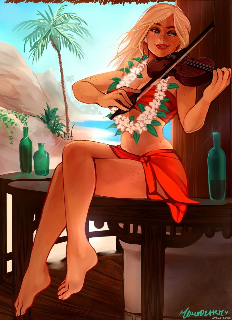 blonde hair, wearing a red dress and holding a violin. She appears to be playing the instrument while seated at a table adorned with items like bottles and cocktails, suggesting a relaxed,