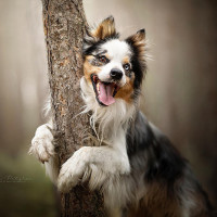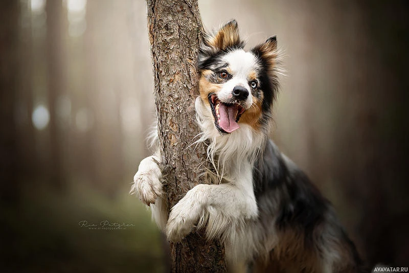 sized breed with a distinctive tri-color coat that resembles the Australian Shepherd. It appears to be standing on its hind legs and leaning against