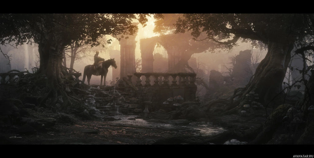 a misty atmosphere, which gives it an otherworldly appearance. The rider sits atop the horse, indicating movement or journeying through this landscape. The scene conveys