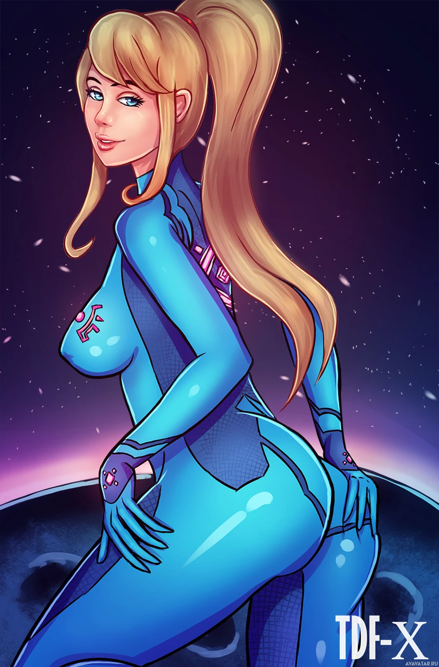 blue suit and helmet, which she wears for combat situations in the game. The art style appears to be influenced by comic book artistry with
