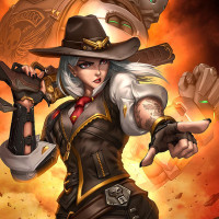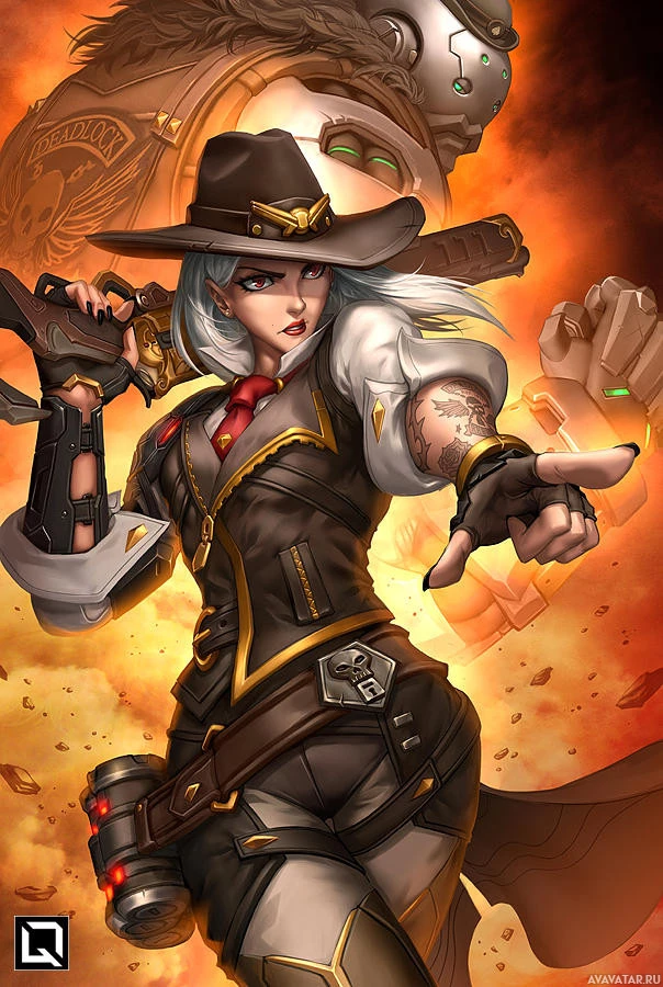 the video game "Overwatch." This character is named Ashe, and she is depicted in her default outfit which includes a black vest with yellow detailing,