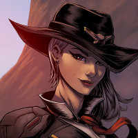 a cowboy hat and holding what appears to be a gun, suggesting they are from the game "Overwatch." Specifically, this character is Ashe,
