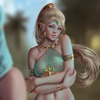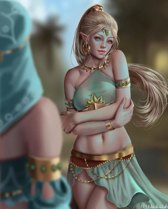 blonde hair and is wearing a traditional elven outfit, which includes a diaphanous top with gold embellishments and a skirt. The character seems to have