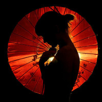 The picture shows a silhouette of a person holding an umbrella. The individual appears to be standing and looking towards the left side, as indicated by their gaze. The umbrella is open and seems to be illuminated from behind, creating a glowing effect that contrasts with the dark background.