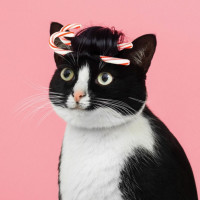 The picture shows a black and white cat sitting upright. It has a whimsical appearance as it is wearing what seems to be a hair accessory designed for a human, with two large